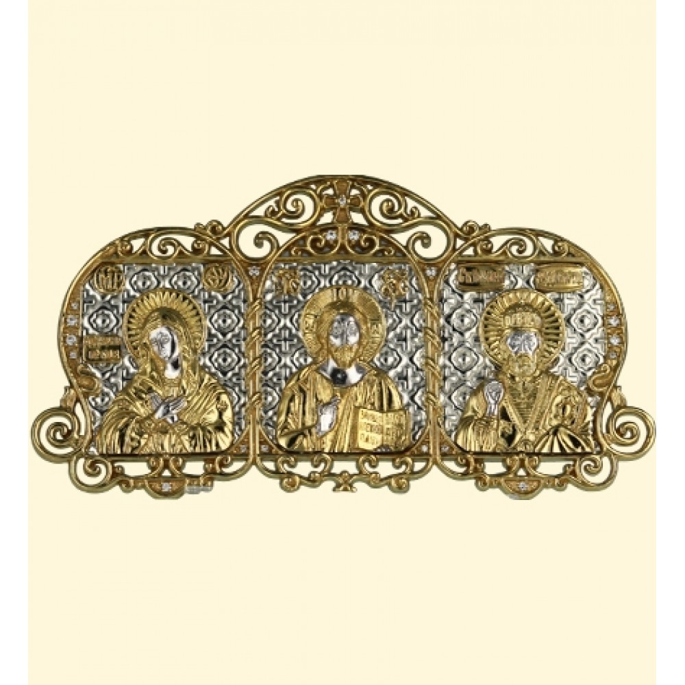 На иконе изображены Божия Матерь Умиление, Спаситель, Святой Николай Чудотворец.