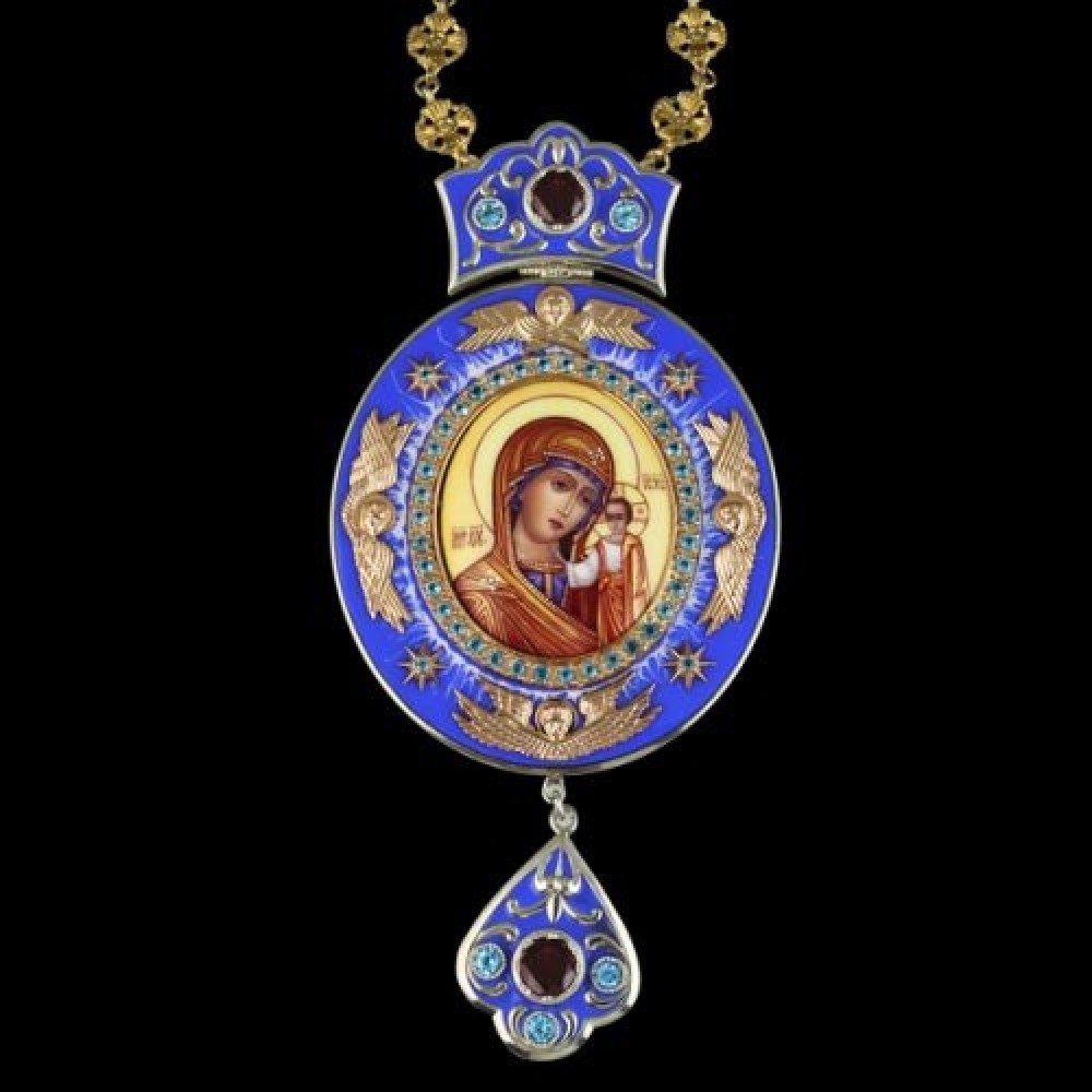 Панагия серебряная с финифтью "Архиерейская" Казанская БМ с натуральными вставками аг-2.7.0052К