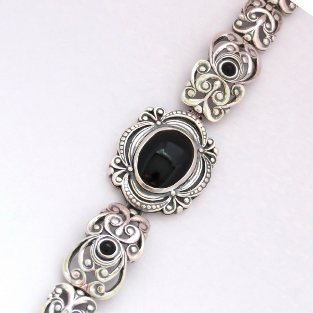 Браслет изготавливается с разными вставками: оникс, бирюза, малахит, улексид.