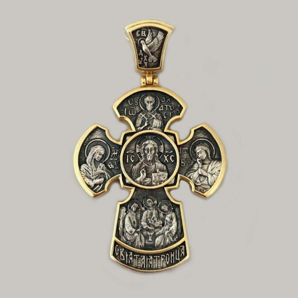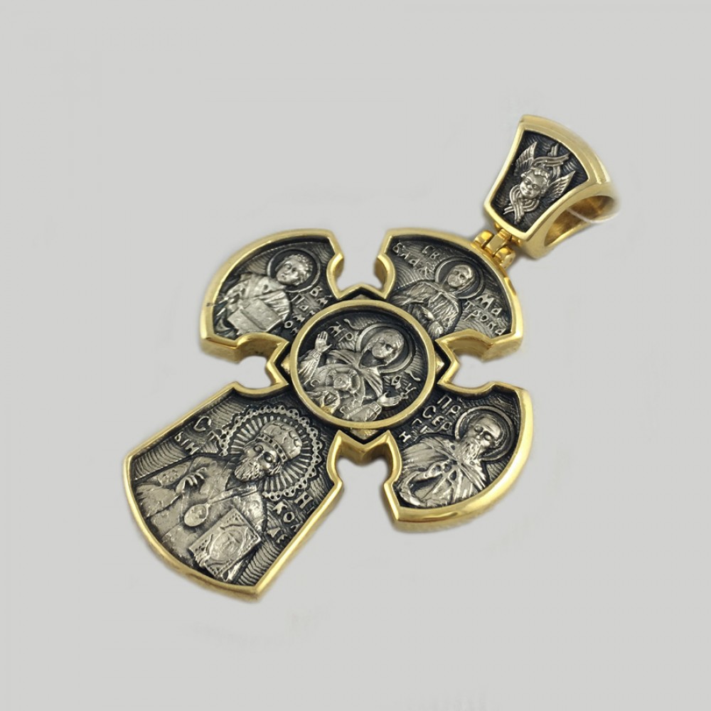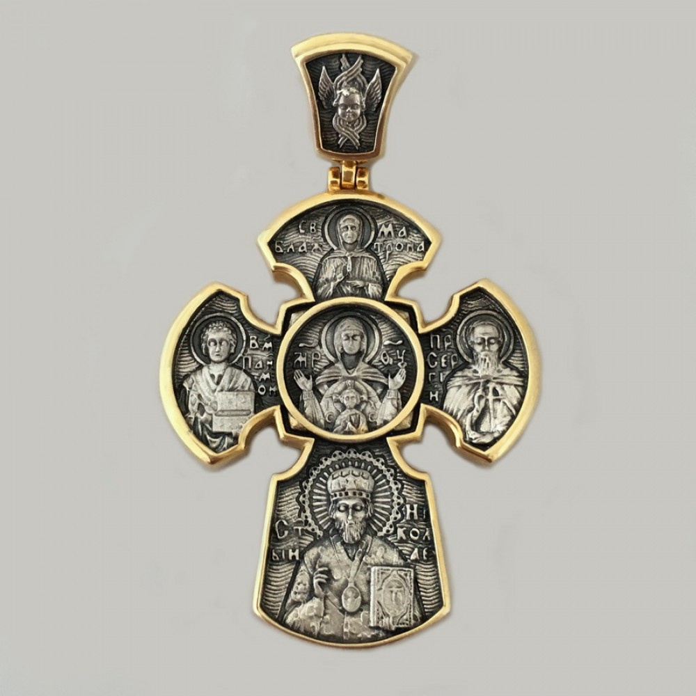 Оригинальный крест с ликами святых: Спасителя, Божией Матери, Святого Николая, Матроны Московской, Пантелеймона Целителя и других.