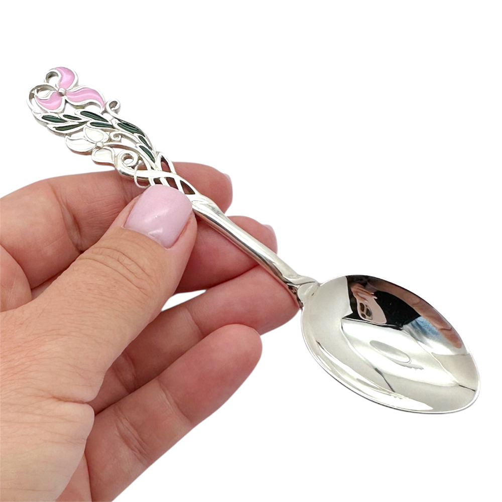 Изготовлена из серебра 925 пробы, украшена утончённым растительным орнаментом в виде лепестков подснежника. Такая ложка станет прекрасным дополнением к чайному сервизу и элегантным подарком для любого случая.